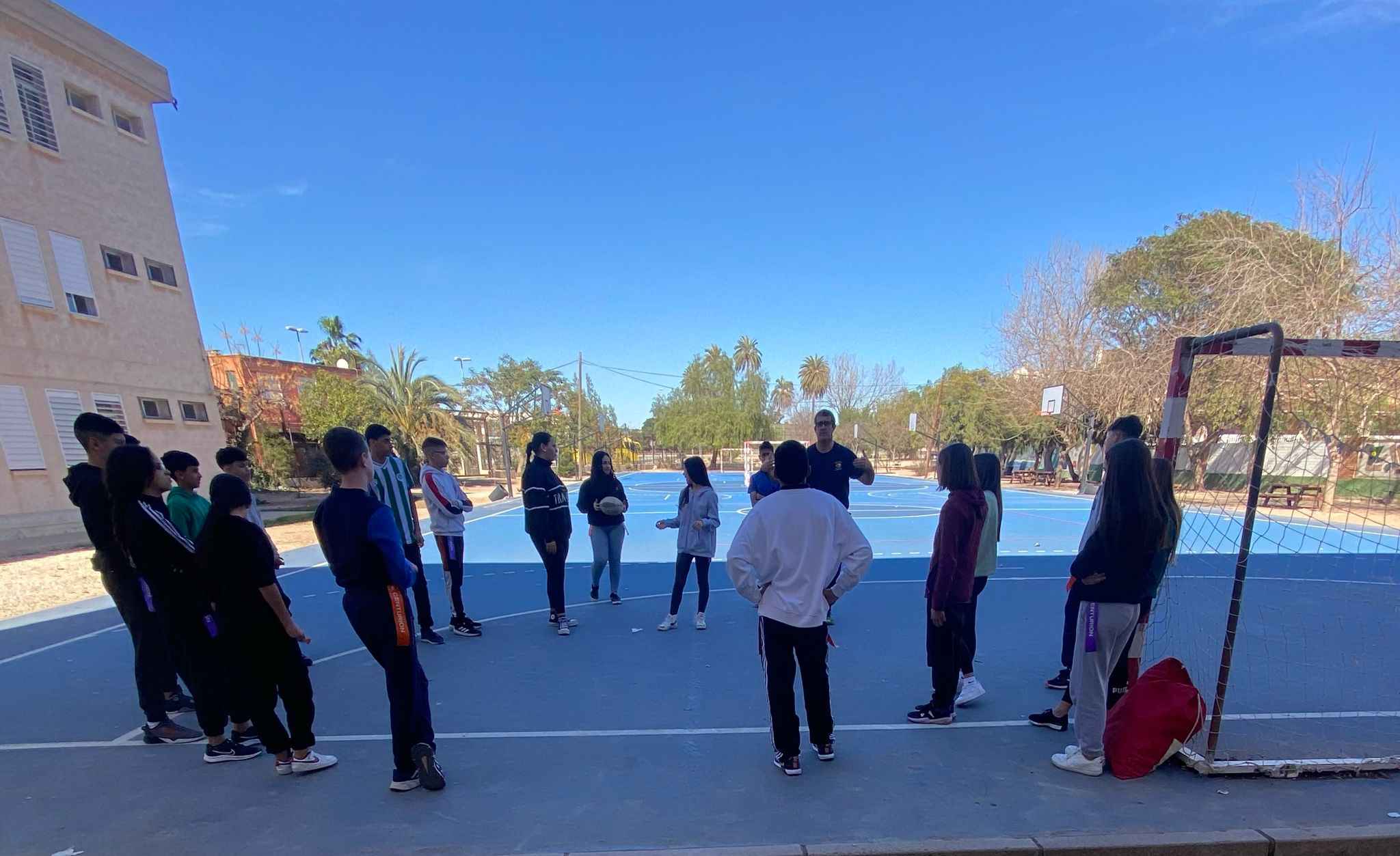 En la mañana del pasado día 13 de febrero visitó nuestro centro Chris Eden, del Club Rugby Universitario Cartagena, con el fin de preparar a impartir una masterclass para los alumnos de 1º y 2º de la ESO que participarán en la próxima edición del Campeonato de Rugby Cinta, que tendrá lugar el próximo viernes 16 en el césped del Campo Mundial 82 junto con otros centros de Cartagena. Las sesiones, aunque breves, fueron intensas y muy interesantes, tal y como manifestaron algunos de los alumnos participantes.